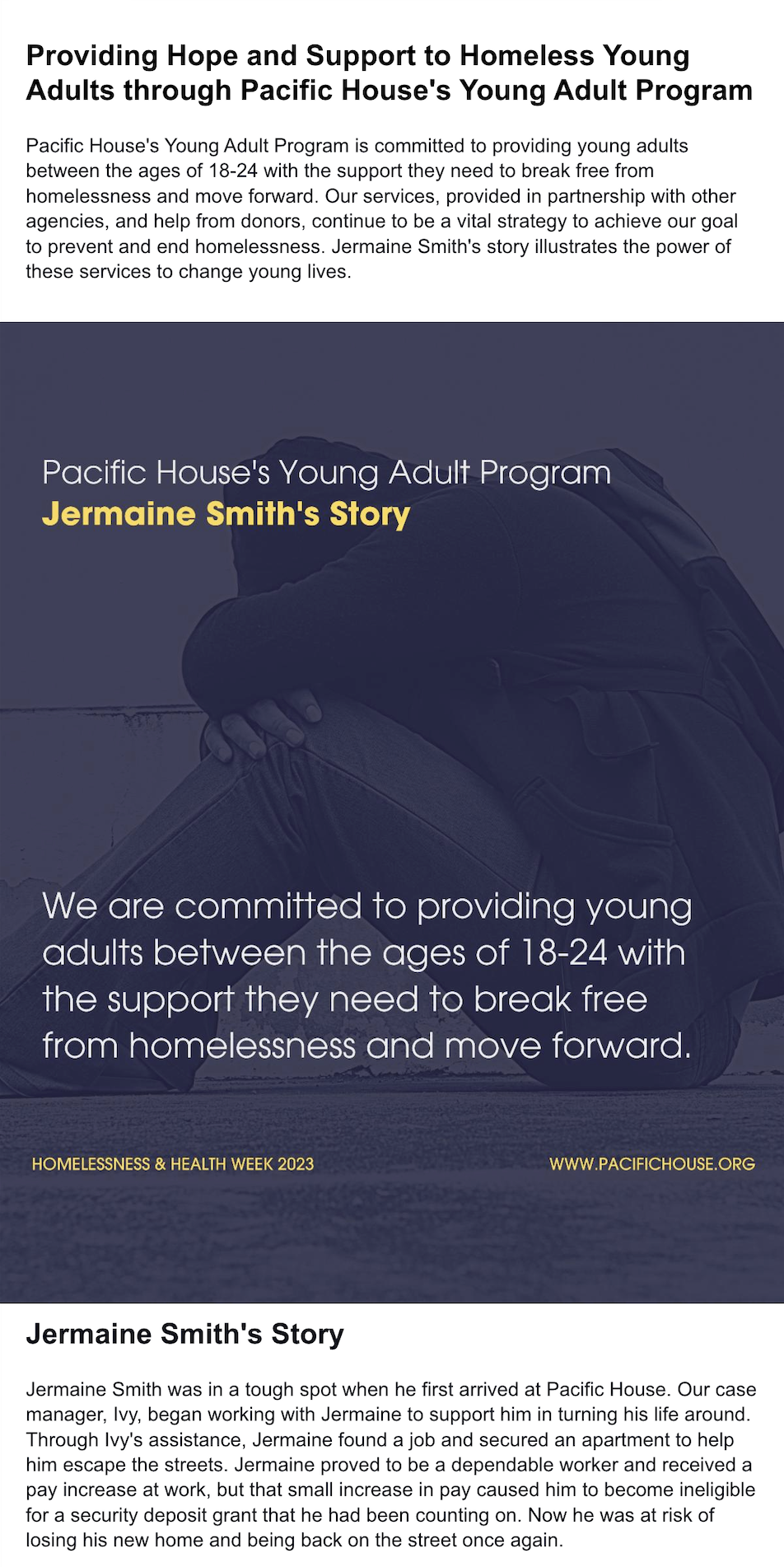 Our mission is clear: Pacific House is committed to providing a safe overnight shelter for men and young adults who are homeless. We pair this with a wide range of support services to assist both men and women (via our day program only) achieve their highest level of self-sufficiency so that they might lead more fulfilling lives.
